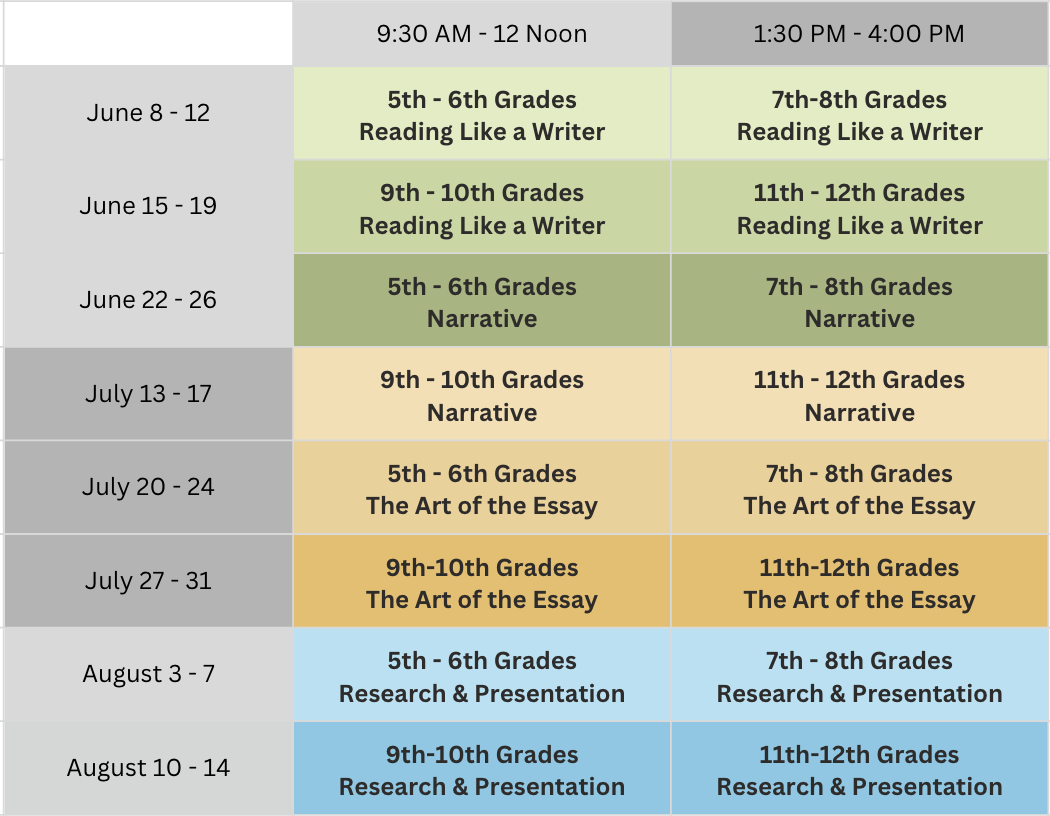 Tuition — $600 (sibling / multisession discount $575) including materials and snacks. (Writers do a lot of snacking.)